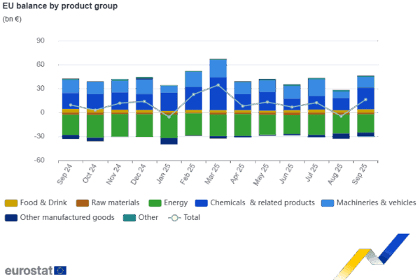 Τον Σεπτέμβριο του 2025, το ισοζύγιο της ΕΕ βελτιώθηκε σημαντικά σε σύγκριση με τον Αύγουστο του 2025, μετατοπιζόμενο από έλλειμμα -4,5 δισ. ευρώ σε πλεόνασμα 16,3 δισ. ευρώ. Αυτή η ανάκαμψη οφείλεται κυρίως σε σημαντική αύξηση στον τομέα των χημικών προϊόντων, όπου το πλεόνασμα αυξήθηκε από 15,4 δισ. ευρώ τον Αύγουστο του 2025 σε 26,9 δισ. ευρώ τον Σεπτέμβριο του 2025.