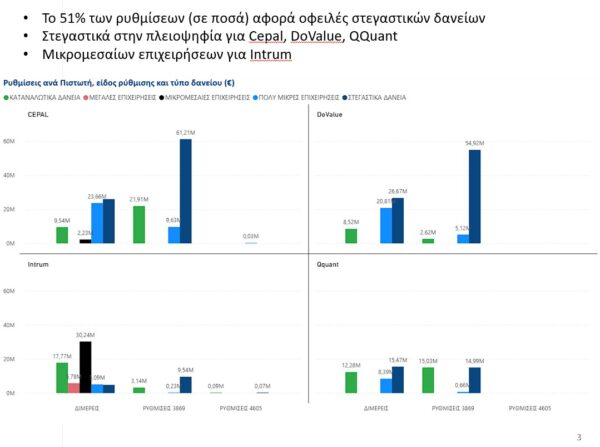 Τον μήνα Σεπτέμβριο συνεχίστηκε η θετική πορεία στις διμερείς ρυθμίσεις δανείων με τους 4 μεγαλύτερους Χρηματοδοτικούς Φορείς (Intrum, Cepal, DoValue, Qquant). Συνολικά πραγματοποιήθηκαν διμερείς ρυθμίσεις ύψους 416 εκ. ευρώ, οι οποίες αντιστοιχούν σε 6.120 οφειλέτες, αυξημένες σε σχέση με τον αντίστοιχο μήνα του 2024 όπου πραγματοποιήθηκαν ρυθμίσεις ύψους 307 εκ. ευρώ για πλήθος 5.328 οφειλετών.