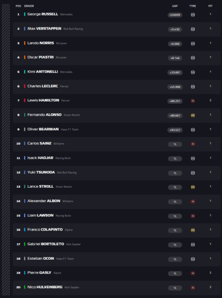 Στο Grand Prix Σιγκαπούρης, ο Τζορτζ Ράσελ (Mercedes) επικράτησε από την pole σε έναν αγώνα διαχείρισης ρυθμού και ελαστικών. Ο Μαξ Φερστάπεν (Red Bull) τερμάτισε δεύτερος, κρατώντας πίσω του τον Λάντο Νόρις (McLaren), ο οποίος συμπλήρωσε το βάθρο. Ο Όσκαρ Πιάστρι (McLaren) ήταν τέταρτος, ενώ ο Άντρεα Κίμι Αντονέλι (Mercedes) ολοκλήρωσε την πρώτη πεντάδα. Το GP Σιγκαπούρης προσέφερε διαρκή πίεση στις μπροστινές θέσεις, χωρίς μεγάλες ανατροπές στην κορυφή.