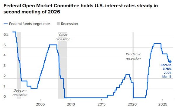 Η Ομοσπονδιακή Τράπεζα των ΗΠΑ (Federal Reserve – Fed) ψήφισε την Τετάρτη να διατηρήσει σταθερό το βασικό της επιτόκιο, καθώς οι υπεύθυνοι χάραξης πολιτικής προσπαθούν να βρουν τον δρόμο τους μέσα από υψηλότερες από τις αναμενόμενες μετρήσεις πληθωρισμού, ανάμεικτα σημάδια στην αγορά εργασίας και έναν πόλεμο στο Ιράν που προκαλεί ενεργηειακή κρίση, όπως μεταδίδει το CNBC.