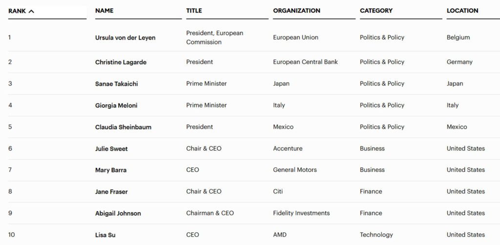 Την πρώτη δεκάδα συμπληρώνουν η πρωθυπουργός της Ιταλίας Τζόρτζια Μελόνι, η πρόεδρος του Μεξικού Κλαούντια Σέινμπαουμ, καθώς και κορυφαίες CEOs, όπως η Μέρι Μπάρα (General Motors), η Τζέιν Φρέιζερ (Citi), η Άμπιγκεϊλ Τζόνσον (Fidelity) και η Λίζα Σου (AMD).