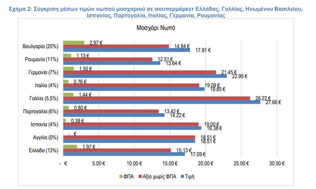 Χαρακτηριστικό της επίδρασης του ΦΠΑ στις τελικές τιμές είναι το παράδειγμα της τιμής στο Νωπό Μοσχάρι. Όπως καταγράφεται στο σχήμα 2, η Ελλάδα έχει μία από τις χαμηλότερες τιμές ανάμεσα στις 9 χώρες (μόνο η Πορτογαλία και η Ρουμανία καταγράφουν χαμηλότερη τιμή), αλλά συγχρόνως έχει τον δεύτερο υψηλότερο ΦΠΑ ανάμεσα στις 10 χώρες, καθώς μαζί με τη Ρουμανία έχει το μοσχάρι στον μεσαίο συντελεστή ΦΠΑ και όχι στον χαμηλό και μόνο η Βουλγαρία το έχει στον υψηλό συντελεστή ΦΠΑ.