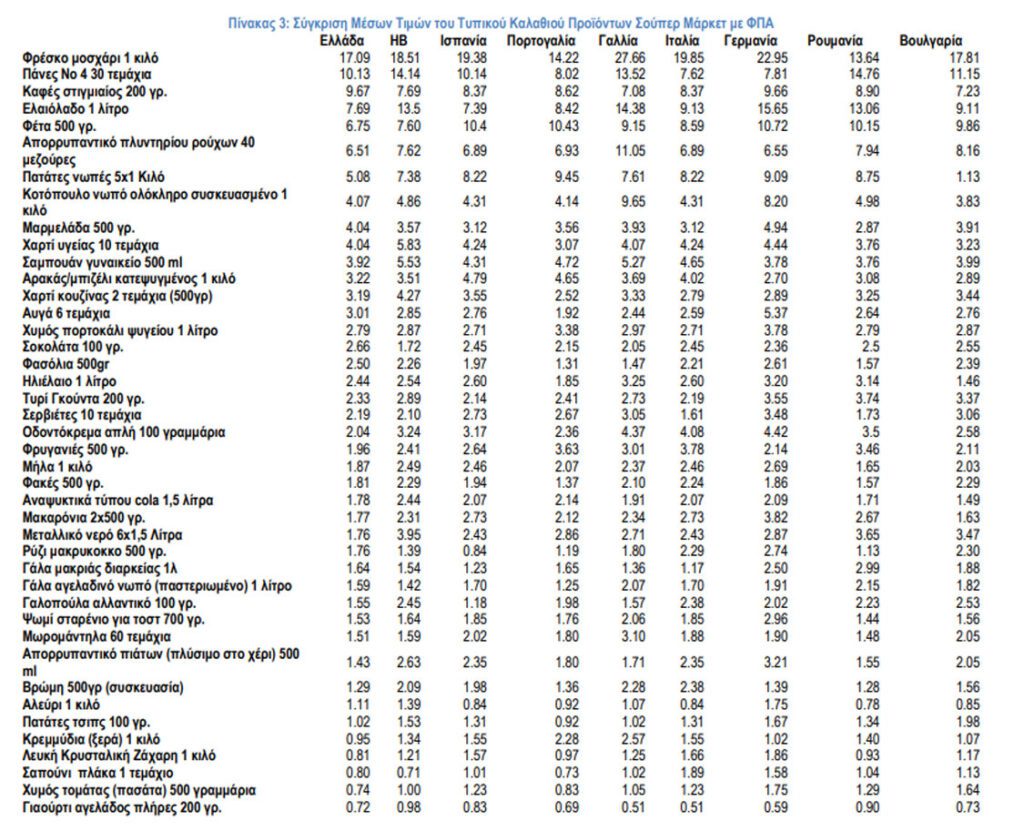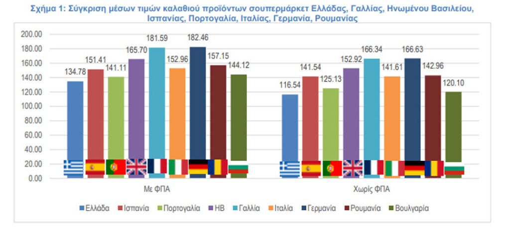 Η σύγκριση των μέσων τιμών των καλαθιών δείχνει ότι οι υπόλοιπες χώρες που εξετάστηκαν, έχουν σημαντικά ακριβότερο μέσο καλάθι από την Ελλάδα, δηλαδή 35% η Γερμανία, 34% η Γαλλία, 23% το Ηνωμένο Βασίλειο, 14% η Ιταλία, 12% η Ισπανία, 17% η Ρουμανία, 5% η Πορτογαλία και 7% η Βουλγαρία.