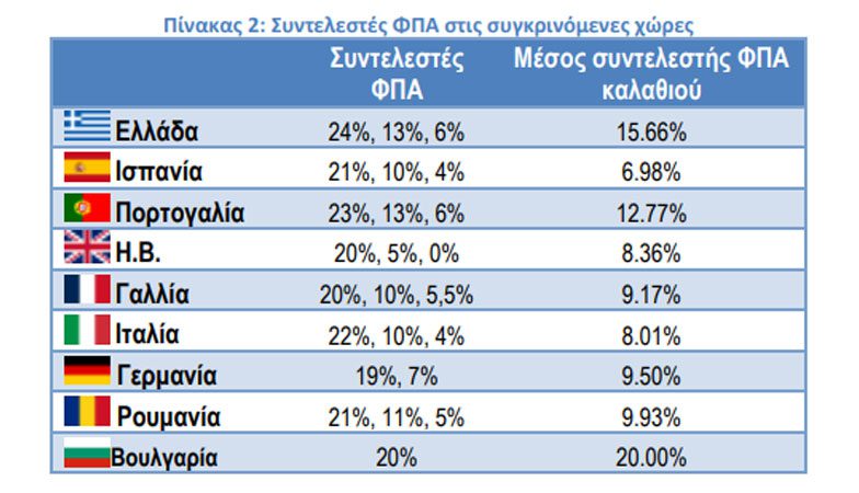Όπως φαίνεται και στον πίνακα 2, η Ελλάδα καταγράφει με διαφορά τον δεύτερο υψηλότερο μέσο συντελεστή ΦΠΑ για το καλάθι των 40 κατηγοριών ανάμεσα στις 10 χώρες με 15,6%, ενώ η Ισπανία τον χαμηλότερο με 7,0% (με πολλά προϊόντα στον χαμηλό συντελεστή), και τις περισσότερες χώρες να κινούνται στην περιοχή του 9-10%.