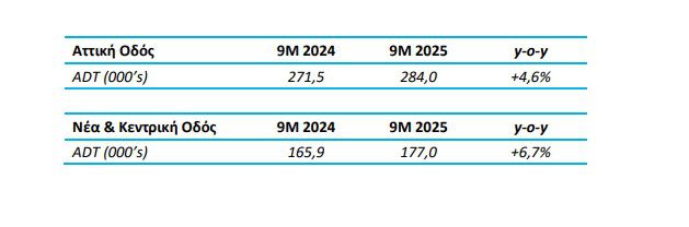 Όσον αφορά τους αυτοκινητόδρομους της Νέας και της Κεντρικής Οδού, για τους πρώτους εννέα μήνες του 2025, η μέση ημερήσια κίνηση παρουσίασε αύξηση κατά 6,7% σε σχέση με την αντίστοιχη περίοδο της