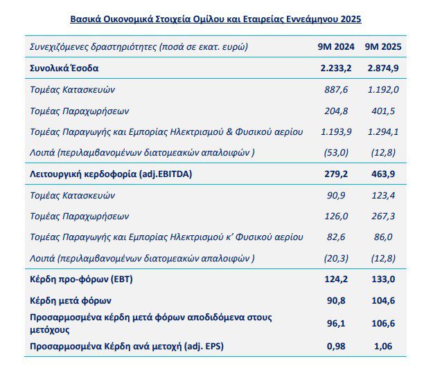 Ο Όμιλος ΓΕΚ ΤΕΡΝΑ ανακοίνωσε τα συνοπτικά οικονομικά αποτελέσματα για το εννεάμηνο Ιανουαρίου-Σεπτεμβρίου 2025. Ο όμιλος συνέχισε και στο εννεάμηνο του 2025 την ανοδική πορεία, εμφανίζοντας θετικές επιδόσεις σε όλους τους βασικούς τομείς δραστηριότητας. Τα ενοποιημένα έσοδα αυξήθηκαν 28,7% και διαμορφώθηκαν σε 2,87 δισ. ευρώ, ενώ η λειτουργική κερδοφορία (adj. EBITDA) ενισχύθηκε 66,2% φτάνοντας τα 463,9 εκατ. ευρώ. Το περιθώριο λειτουργικής κερδοφορίας βελτιώθηκε σημαντικά, στο 16,1% από 12,5% ένα χρόνο πριν, αποτυπώνοντας το πιο ποιοτικό μείγμα πωλήσεων του ομίλου.