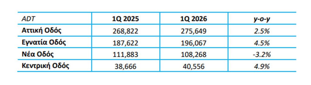 Ο Όμιλος ΓΕΚ ΤΕΡΝΑ ανακοίνωσε τα στοιχεία κίνησης για τους βασικούς εν λειτουργία αυτοκινητοδρόμους του για το Α’ Τρίμηνο του 2026.