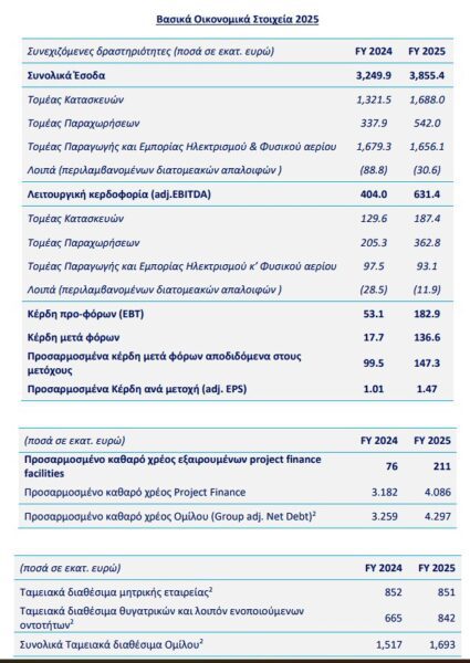 Πιο συγκεκριμένα σύμφωνα με τα οικονομικά αποτελέσματα του 2025, αύξηση της τάξεως του 18,6% παρουσίασαν τα έσοδα του Ομίλου κατά τη χρήση 2025 και ανήλθαν σε 3.855,4 εκατ. ευρώ. Ταυτόχρονα, η λειτουργική κερδοφορία (adj. EBITDA) του Ομίλου αυξήθηκε κατά 56,3%, φθάνοντας τα 631,4 εκατ. ευρώ.