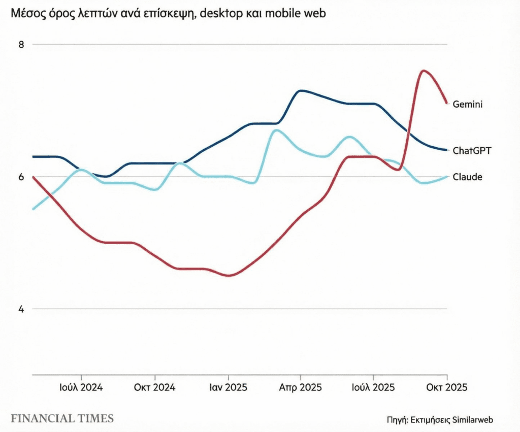 Παρά τους 800 εκατομμύρια εβδομαδιαίους χρήστες της OpenAI, οι άνθρωποι περνούν τώρα περισσότερο χρόνο με το Gemini από ό,τι με το ChatGPT, σύμφωνα με την Similarweb.
