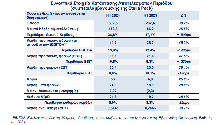 -Οι δημοσιευμένες πωλήσεις το Α΄ εξάμηνο 2024 (συμπεριλαμβάνοντας τη Stella Pack) ανήλθαν σε €302,6εκ. έναντι €232,4εκ. το Α’ εξάμηνο 2023, αυξημένες 30,2% υπογραμμίζοντας τη συνεισφορά της Stella Pack.