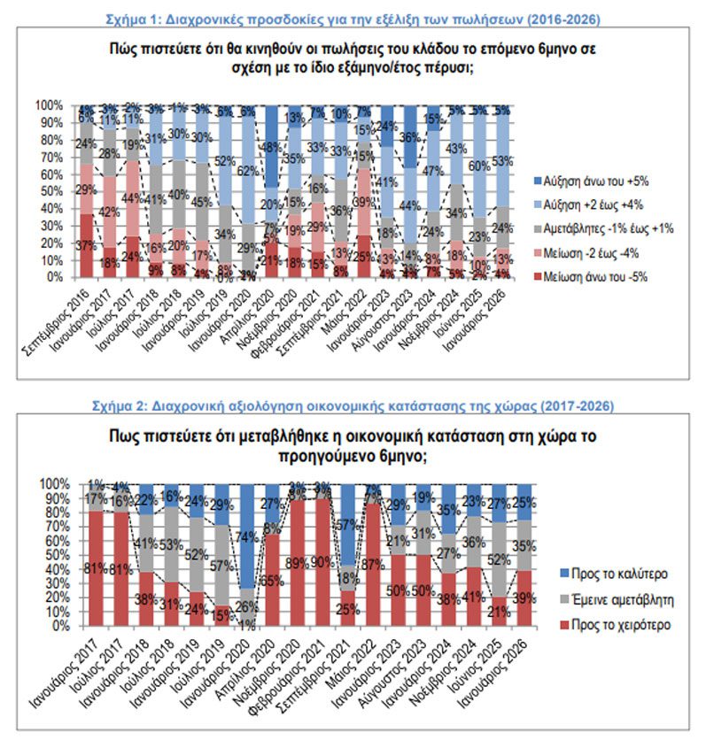 Η έρευνα, που διεξήχθη τον Ιανουάριο 2026 σε δείγμα 120 ανώτερων και ανώτατων στελεχών λιανεμπορίου, αποτυπώνει ένα περιβάλλον συγκρατημένης αισιοδοξίας με περιορισμένη αύξηση της αξίας των πωλήσεων, σταθεροποίηση του όγκου και θετικό αλλά εύθραυστο οικονομικό κλίμα.