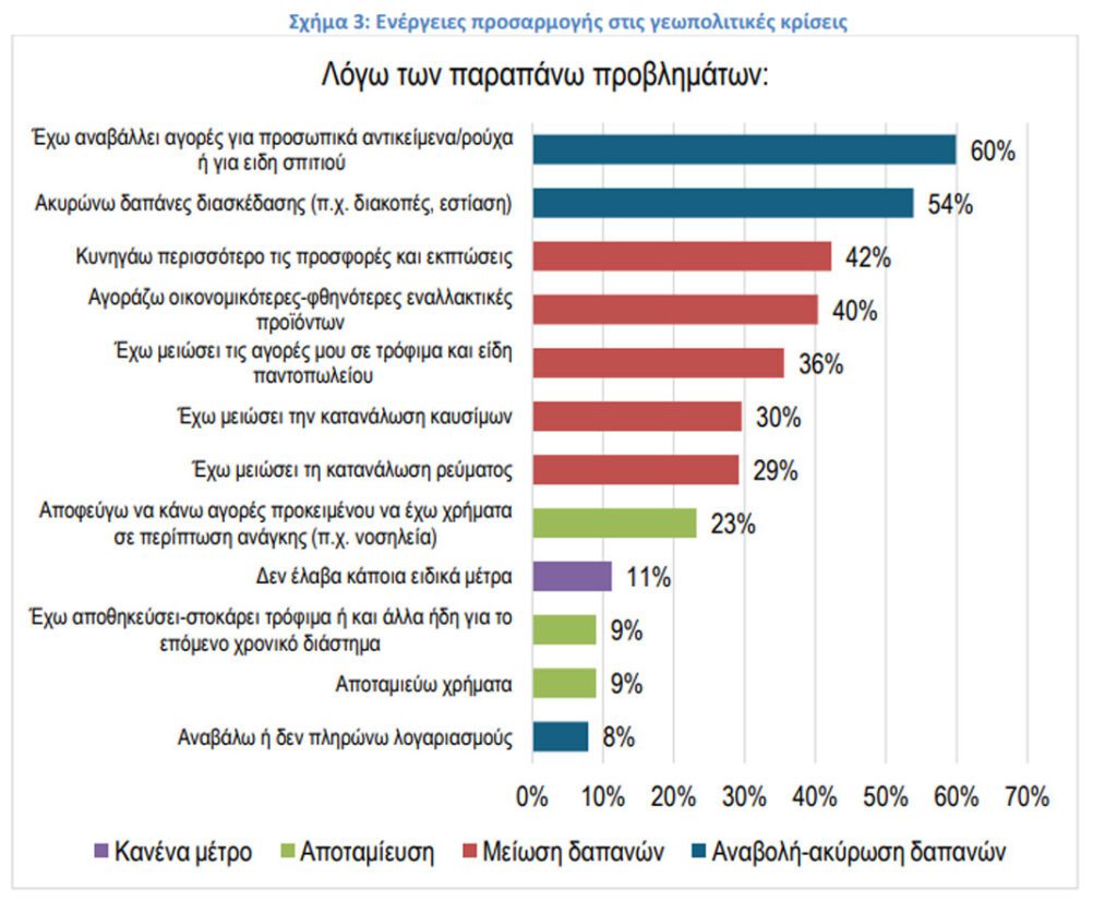 Όπως καταγράφεται, οι καταναλωτές προχωρούν σε άμεσες προσαρμογές της καθημερινής τους συμπεριφοράς με κύριες κατευθύνσεις την αναβολή δαπανών και την μείωση δαπανών.