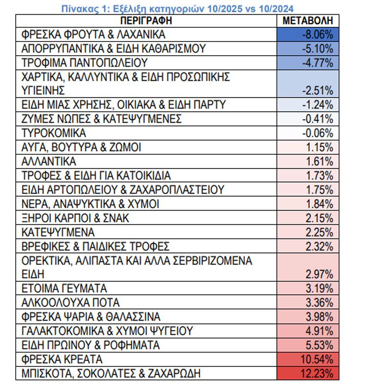 Μεγαλύτερες μειώσεις τιμών τον Οκτώβριο 2025 σε σχέση με τον Οκτώβριο 2024 καταγράφονται στις κατηγορίες: