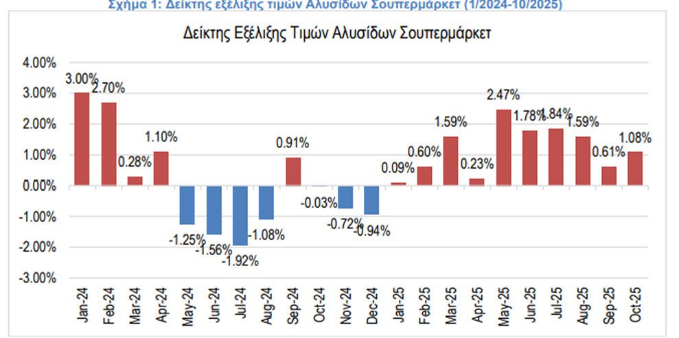 1. Ο πληθωρισμός στις αλυσίδες σουπερμάρκετ είναι της τάξης του +1,08% τον Οκτώβριο 2025 σε σχέση με τον Οκτώβριο 2024, σε χαμηλότερα επίπεδα σε σχέση με την περίοδο Μαΐου-Αυγούστου 2025.