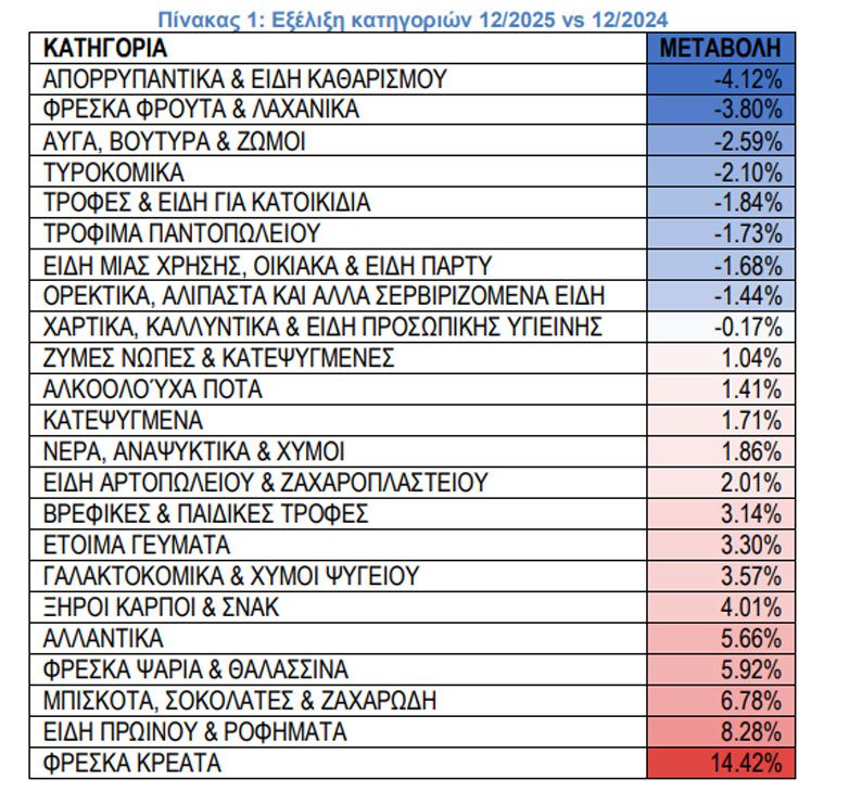 Ανοδική πορεία κατέγραψαν οι τιμές στα σούπερ μάρκετ τον Δεκέμβριο 2025 σε σύγκριση με τον αντίστοιχο μήνα του 2024, σύμφωνα με τα ευρήματα της στοχευμένης μηνιαίας έρευνας του Ινστιτούτου Έρευνας Λιανεμπορίου Καταναλωτικών Αγαθών (ΙΕΛΚΑ).