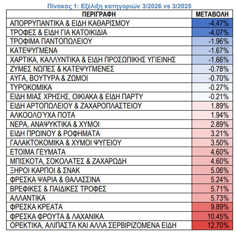 Στο πλαίσιο στοχευμένης μηνιαίας έρευνας του Ινστιτούτου Έρευνας Λιανεμπορίου Καταναλωτικών Αγαθών (ΙΕΛΚΑ) αποκλειστικά στο κανάλι των μεγάλων αλυσίδων σουπερμάρκετ σχετικά με τις πληθωριστικές τάσεις στο οργανωμένο λιανεμπόριο τροφίμων, εξετάστηκε η πορεία των τιμών τον Μάρτιο 2026 σε σχέση με τον Μάρτιο 2025.