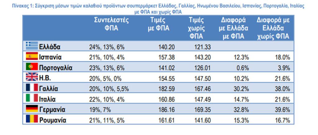 Η εικόνα των αποτελεσμάτων αλλάζει σημαντικά όταν αφαιρέσουμε τον αναλογούντα ΦΠΑ ανά χώρα για να γίνουν αντιληπτές οι πραγματικές τιμές των προϊόντων σουπερμάρκετ. Η σύγκριση των καλαθιών σε αυτή την περίπτωση (σχήμα 1 και πίνακας 1) δείχνει ότι οι και οι επτά χώρες έχουν πιο ακριβό μέσο καλάθι από την Ελλάδα, η Γερμανία κατά 39%, η Γαλλία κατά 38%, το Ηνωμένο Βασίλειο κατά 22%, η Ιταλία κατά 22%, η Ισπανία κατά 18% η Πορτογαλία κατά 4% και η Ρουμανία κατά 17%. Αυτό είναι αποτέλεσμα της διαφοράς που έχει ο χαμηλός ΦΠΑ ανά χώρα (πρόκειται για τον ΦΠΑ που αναφέρεται σε τρόφιμα και ποτά). Στην Ελλάδα αυτός ο ΦΠΑ είναι 13%.