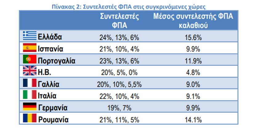 Όπως φαίνεται και στον πίνακα 2, η Ελλάδα καταγράφει με διαφορά τον υψηλότερο μέσο συντελεστή ΦΠΑ για το καλάθι των 40 κατηγοριών ανάμεσα στις 9 χώρες με 15,6%, ενώ το Ηνωμένο Βασίλειο τον χαμηλότερο με 4,8% (με πολλά προϊόντα στον μηδενικό συντελεστή), και τις περισσότερες χώρες να κινούνται στην περιοχή του 9-10%.