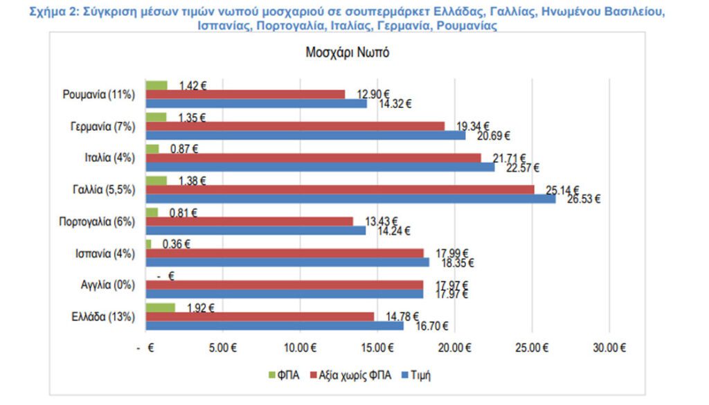 Χαρακτηριστικό της επίδρασης του ΦΠΑ στις τελικές τιμές είναι το παράδειγμα της τιμής στο Νωπό Μοσχάρι. Όπως καταγράφεται στο σχήμα 2, η Ελλάδα έχει μία από τις χαμηλότερες τιμές ανάμεσα στις 9 χώρες (μόνο η Πορτογαλία και η Ρουμανία καταγράφουν χαμηλότερη τιμή), αλλά συγχρόνως έχει τον υψηλότερο ΦΠΑ ανάμεσα στις 9 χώρες, καθώς είναι η μόνη χώρα μαζί με τη Ρουμανία η οποία έχει το μοσχάρι στον μεσαίο συντελεστή ΦΠΑ και όχι στον χαμηλό.