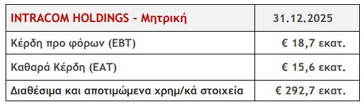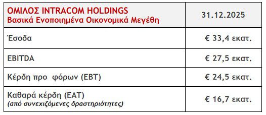 Η INTRACOM HOLDINGS (Euronext Athens: INTKA) ανακοινώνει τα οικονομικά αποτελέσματα του έτους 2025, σύμφωνα με τα διεθνή λογιστικά πρότυπα: