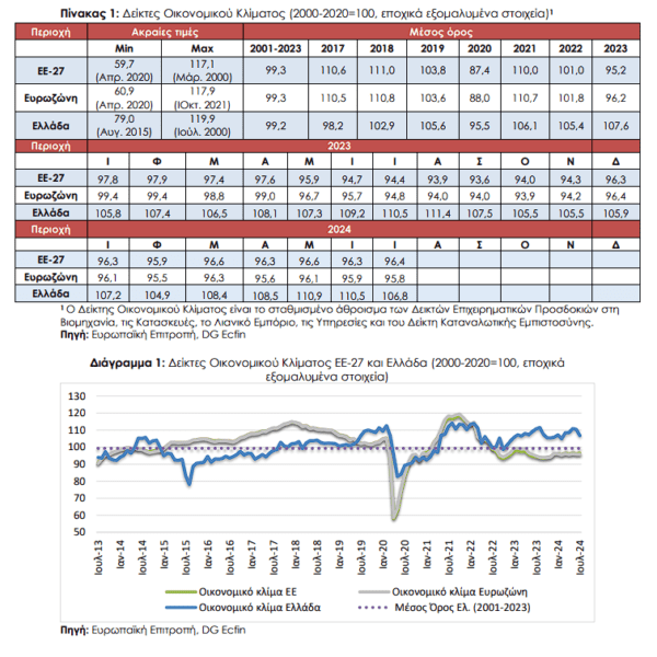 Ο δείκτης οικονομικού κλίματος διαμορφώθηκε στις 106,8 μονάδες από τις 110,5 που ήταν τον Ιούνιο