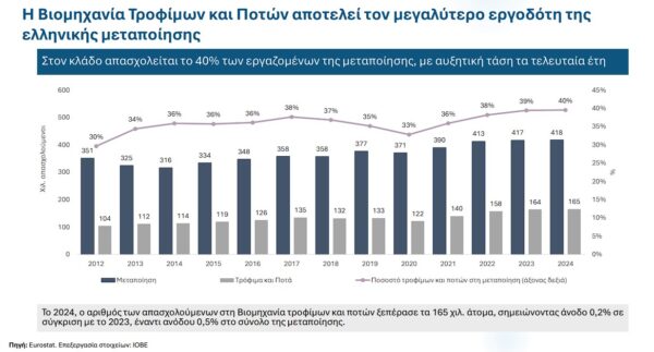 Αποτελεί τον μεγαλύτερο εργοδότη της ελληνικής μεταποίησης, με 165.000 εργαζόμενους το 2024, δηλαδή το 40% του συνόλου της μεταποίησης. Οι εξαγωγές του κλάδου τροφίμων-ποτών έφτασαν τα 7,0 δισ. ευρώ το 2024, καλύπτοντας το 14% των συνολικών εξαγωγών αγαθών της χώρας.