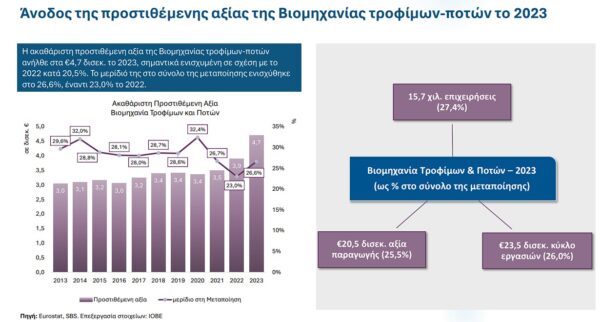 Από το ειδικό θέμα της έρευνας «Η Βιομηχανία Τροφίμων και Ποτών στην Ελλάδα, 2024», προκύπτει ότι ο κλάδος αυτός παραμένει κορυφαίος στον τομέα της μεταποίησης. Συγκεκριμένα, δημιούργησε το 26,6% της συνολικής προστιθέμενης αξίας της μεταποίησης το 2023, με κύκλο εργασιών 4,7 δισ. ευρώ, αυξημένο κατά 20,5% σε σύγκριση με το 2022.