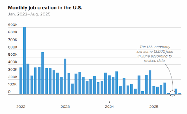 Η δημιουργία νέων θέσεων εργασίας μειώθηκε κατακόρυφα τον Αύγουστο στις ΗΠΑ, ενισχύοντας τα πρόσφατα σημάδια αποδυνάμωσης της αγοράς εργασίας και πιθανώς διατηρώντας την Ομοσπονδιακή Τράπεζα σε τροχιά για μια ευρέως αναμενόμενη μείωση των επιτοκίων αργότερα αυτόν τον μήνα, όπως μεταδίδει το CNBC.