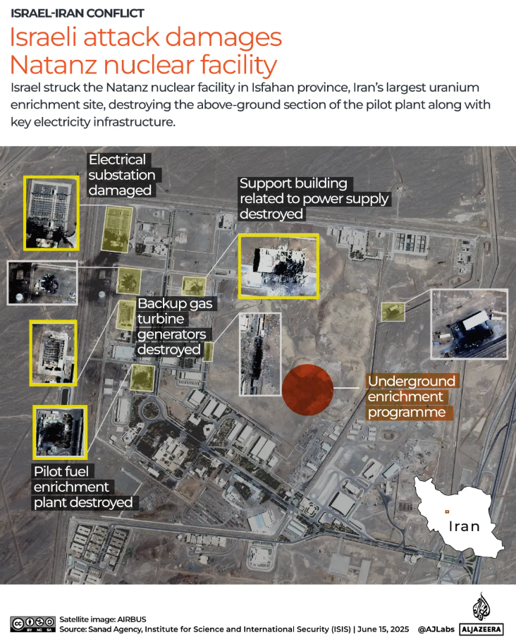 Στη Νατάνζ, βρίσκεται η κύρια εγκατάσταση εμπλουτισμού ουρανίου του Ιράν. Ιρανικά ΜΜΕ αναφέρουν ότι δέχτηκε ξανά σήμερα επίθεση από τις ΗΠΑ και το Ισραήλ. Η εγκατάσταση είχε πληγεί κατά την πρώτη εβδομάδα του πολέμου και, σύμφωνα με δορυφορικές εικόνες, πολλά κτίρια φαίνονταν κατεστραμμένα.