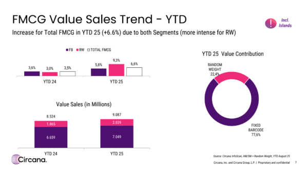 Χαρακτηριστικό είναι, δε, ότι αυτές οι αγορές έγινε στο μεγαλύτερο τους βαθμό σε μεγάλα ύπερ μάρκετ πάνω των 2,500 τμ, με αύξηση 7,2% σε σχέση με την αντίστοιχη περίοδο το 2024, ενώ ακολουθούν με 7,1% άνοδο συγκριτικά με το 2024 τα μικρά μαγαζιά γειτονιάς μέχρι 400 τμ.