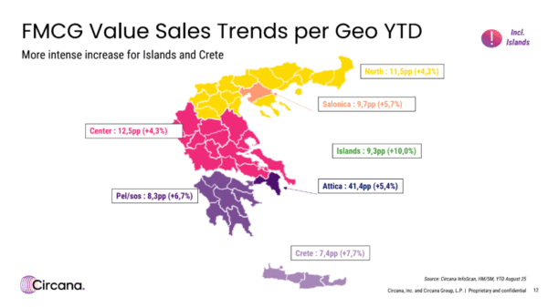 Σε αυτό το πλαίσιο, κατά τη διάρκεια του περασμένου Αυγούστου, η κατανάλωση καθημερινών προϊόντων μεταφέρεται από τα αστικά κέντρα στα νησιά και την Κρήτη. Κατά την μελέτη της Circana, στα ελληνικά νησιά η κατανάλωση αυξήθηκε τον Αύγουστο κατά 10%, ενώ στην Κρήτη κατά 7,7%.