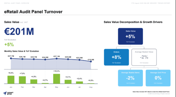 Σε αυτό το πλαίσιο, οι παραγγελίες τον Αύγουστο ήταν αυξημένες κατά 8%, ενώ οι πωλήσεις σε αξία κατέγραψαν άνοδο μόλις 5%, την ώρα που η αξία του ηλεκτρονικού καλαθιού κατρακύλησε κατά -2%.