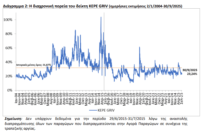 Νέα μείωση κατέγραψε η τιμή του δείκτη τεκμαρτής μεταβλητότητας KEPE GRIV ή δείκτη «φόβου» του ΚΕΠΕ τον Σεπτέμβριο του 2025, φτάνοντας το 23,24% στις 30/9/2025 από το 23,50% στις 29/8/2025.