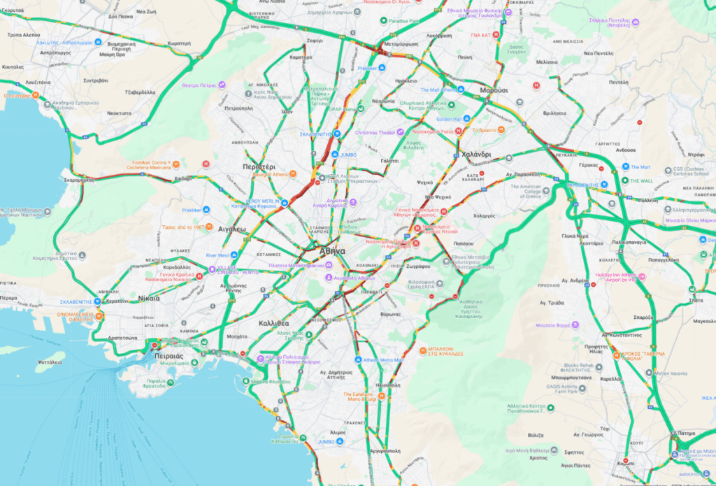 Αυξημένη κίνηση κατά τμήματα σε Κηφισιάς και Μεσογείων και στα δύο ρεύματα, στην λεωφόρο Αθηνών από Χαϊδάρι προς Ασπρόπυργο, στην ανηφόρα του Καρέα, την άνοδο της Συγγρού από τη Λαγουμιτζή, την Καλιρρόης και τη Βασιλέως Κωνσταντίνου.