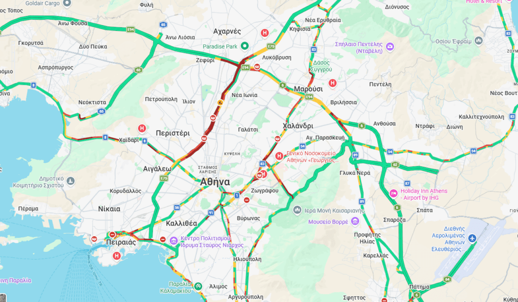 Η κατάσταση αφορά και τα δύο ρεύματα κυκλοφορίας, από τη Λεωφόρο Αθηνών μέχρι τη Μεταμόρφωση, ενώ στο ρεύμα προς Πειραιά η κίνηση αρχίζει να χαλαρώνει μετά το Περιστέρι.