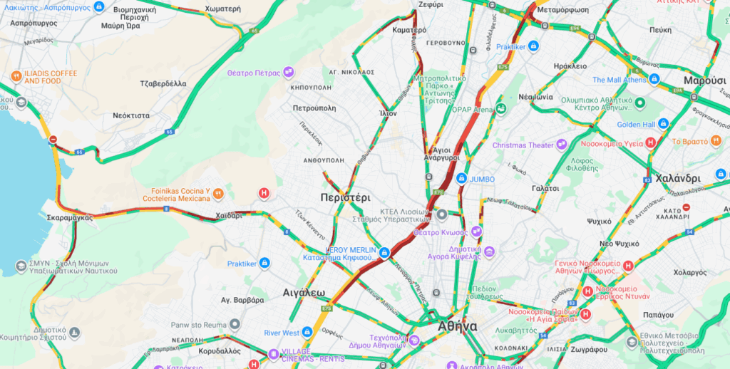 Φυσικά και στο κέντρο της Αθήνας η κίνηση είναι κατά βάση σε χαμηλές ταχύτητες, όπως και στους δρόμους γύρω από το λιμάνι του Πειραιά.
