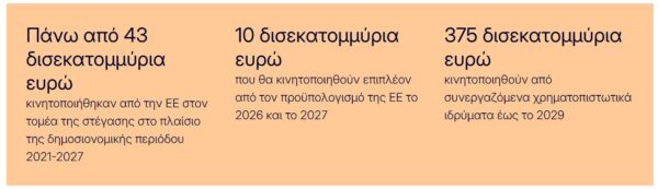 Στην παρουσίαση για το Ευρωπαϊκό Σχέδιο για την Προσιτή Στέγαση στο Στρασβούργο επισημάνθηκε ότι μέχρι σήμερα η Επιτροπή έχει κινητοποιήσει σημαντικές επενδύσεις ύψους 43 δισ. ευρώ στον τομέα της στέγασης και θα συνεχίσει στο πλαίσιο του επόμενου μακροπρόθεσμου προϋπολογισμού της ΕΕ.