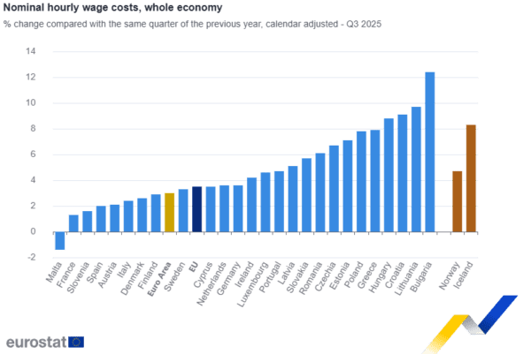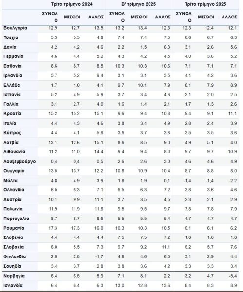 Κατά το τρίτο τρίμηνο του 2025, σε σύγκριση με το ίδιο τρίμηνο του προηγούμενου έτους, οι μεγαλύτερες αυξήσεις στο ωριαίο κόστος μισθοδοσίας για ολόκληρη την οικονομία καταγράφηκαν στη Βουλγαρία (+12,4%), τη Λιθουανία (+9,7%), την Κροατία (+9,1%) και την Ουγγαρία (+8,8%). Οι χαμηλότερες αυξήσεις καταγράφηκαν στη Γαλλία (+1,3%), τη Σλοβενία (+1,6%), την Ισπανία (+2,0%), την Αυστρία (+2,1%) και την Ιταλία (+2,4%), ενώ η Μάλτα κατέγραψε μείωση -1,4%.