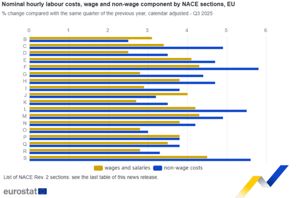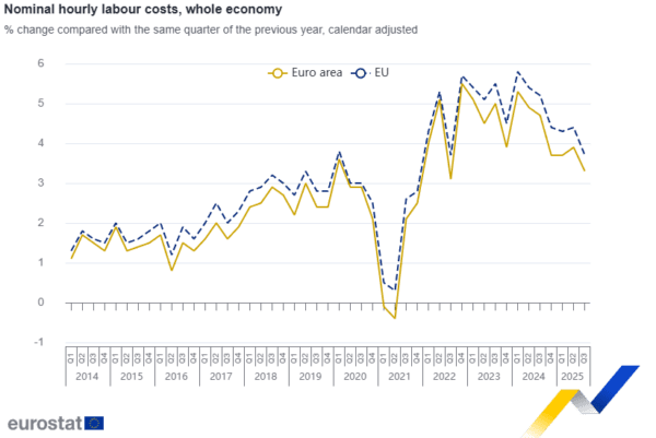 Το τρίτο τρίμηνο του 2025, το ωριαίο κόστος εργασίας αυξήθηκε κατά 3,3% στη ζώνη του ευρώ και κατά 3,7% στην ΕΕ , σε σύγκριση με το ίδιο τρίμηνο του προηγούμενου έτους, σύμφωνα με την Eurostat .