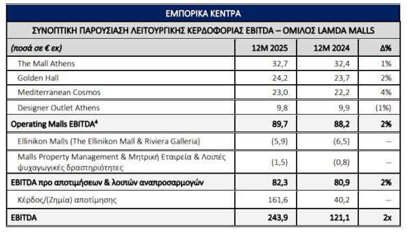 Τα τέσσερα (4) Εμπορικά Κέντρα σε λειτουργία κατέγραψαν για ακόμη ένα έτος νέο ιστορικό υψηλό σε Operating EBITDA, τα οποία διαμορφώθηκαν στα €89,7εκ το 2025. Το Operating Malls EBITDA, προσαρμοσμένο για μεταχρεώσεις εξόδων διοικητικής υποστήριξης και λοιπών υποστηρικτικών λειτουργιών ύψους €6,2εκ, ανήλθε στα €95,9εκ, αυξημένο κατά 4% σε ετήσια βάση.