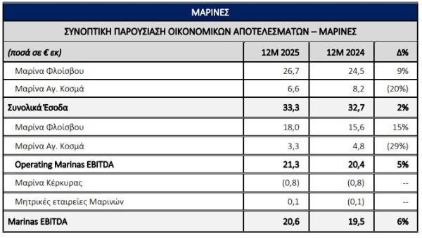 - Νέο Ρεκόρ EBITDA για τις Μαρίνες στα €20,6εκ αυξημένα κατά 6% σε σχέση με το 2024