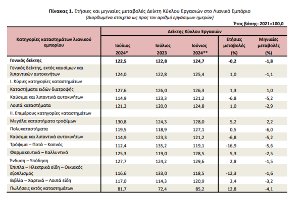 - Ο Γενικός Δείκτης Όγκου (κύκλος εργασιών σε σταθερές τιμές), κατά τον μήνα Ιούλιο 2024, σε σύγκριση με τον αντίστοιχο δείκτη του Ιουλίου 2023, παρουσίασε μείωση 2,8% και σε σύγκριση με τον αντίστοιχο δείκτη του Ιουνίου 2024 αύξηση 1,2%.