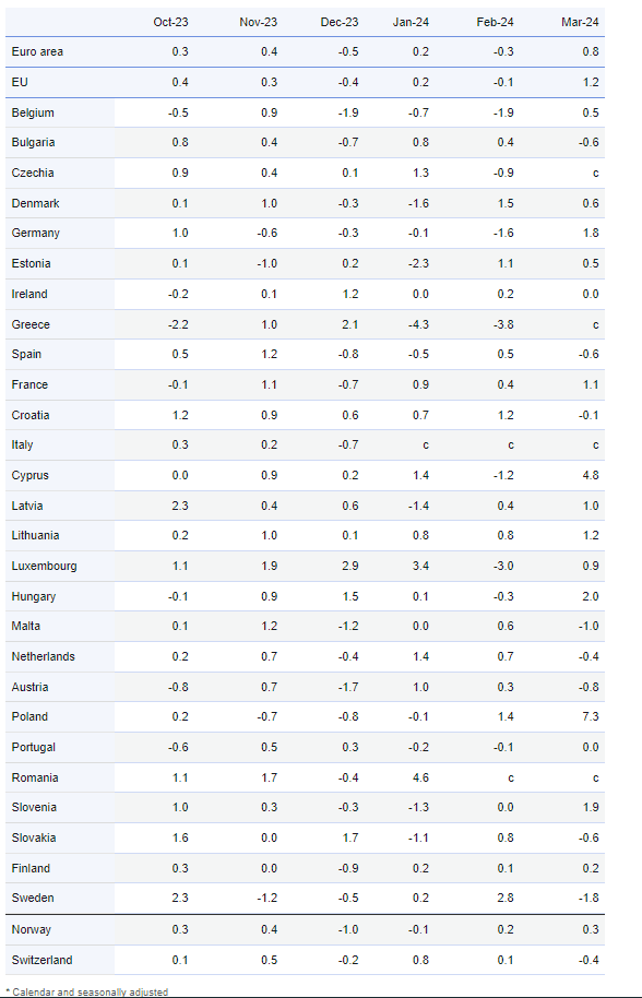 Τον Μάρτιο του 2024 σε σύγκριση με τον Φεβρουάριο του 2024 ο εποχικά προσαρμοσμένος όγκος λιανικού εμπορίου αυξήθηκε 0,8% στη ζώνη του ευρώ και 1,2% στην Ευρωπαϊκή Ένωση σύμφωνα με τις πρώτες εκτιμήσεις της Eurostat που δημοσιοποιήθηκαν την Τρίτη 7 Μαΐου (τον Φεβρουάριο του 2024, ο όγκος του λιανικού εμπορίου είχε μειωθεί 0,3% στη ζώνη του ευρώ και 0,1% στην ΕΕ).