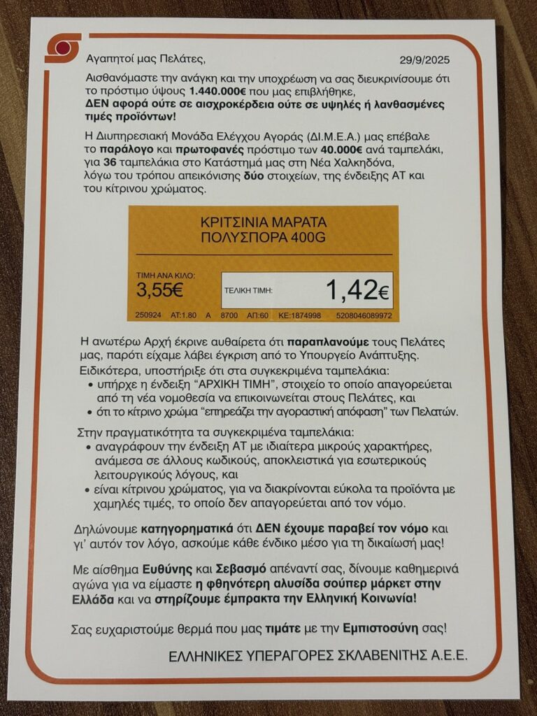 Την ίδια ώρα, ο Σκλαβενίτης συνοδεύει την αμυντική επικοινωνία με επιθετικό μήνυμα τιμών. Σε διαδικτυακή και ενδοκαταστημιακή καμπάνια προβάλλει το σύνθημα «Είμαστε οι φθηνότεροι», επιχειρώντας να «κλειδώσει» την αντίληψη χαμηλού καλαθιού εν μέσω αναστάτωσης στην αγορά.