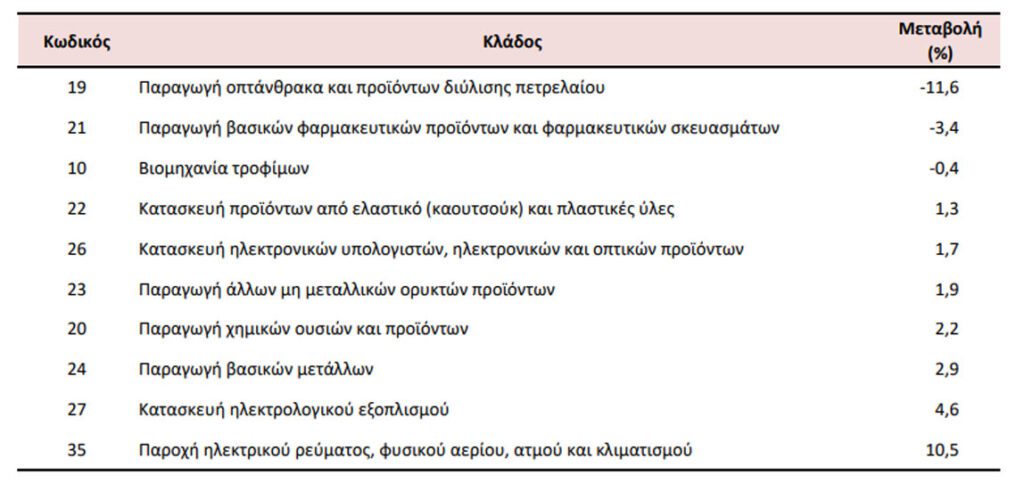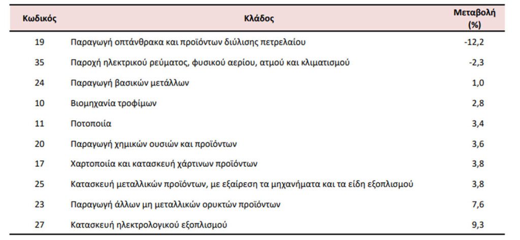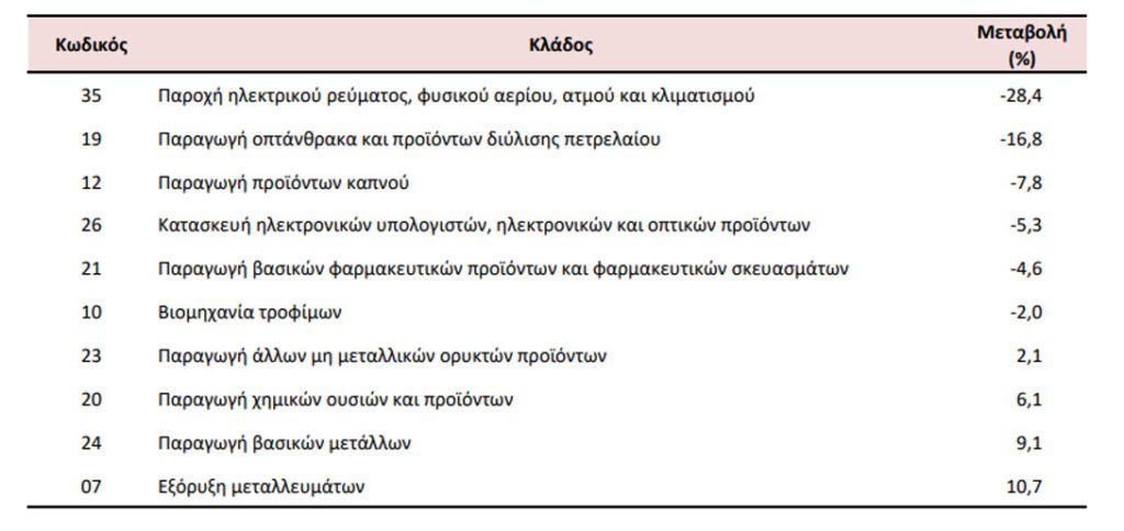 Ειδικότερα, στη μείωση αυτή συνέβαλαν κυρίως οι μεταβολές των δεικτών των διψήφιων κλάδων της ταξινόμησης NACE Αναθ. 2, ως εξής: