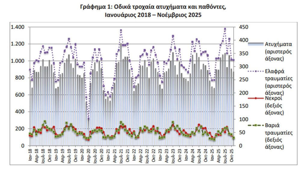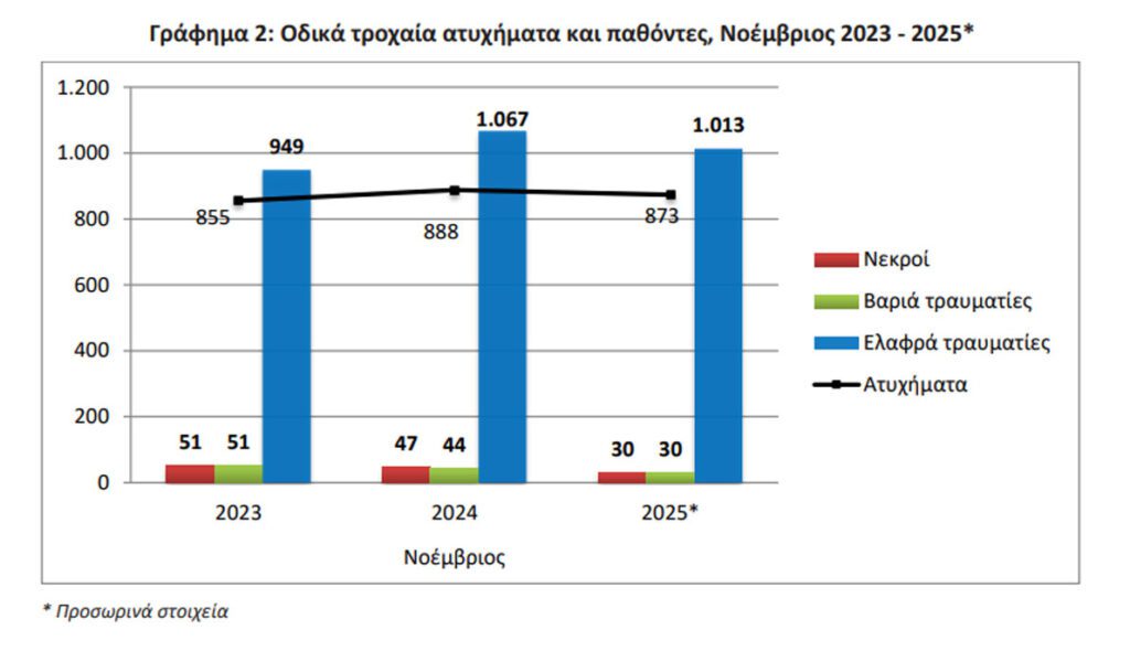 - Μείωση των τροχαίων (1,7%) και των θυμάτων (36,2%) τον Νοέμβριο του 2025