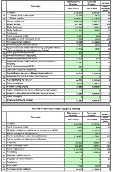 Συγκεκριμένα σύμφωνα με τη σχετική ανακοίνωση, οι πωλήσεις διαμορφώθηκαν σε 3,23 εκατ. ευρώ, σημειώνοντας πτώση περίπου 7% σε σχέση με τα 3,48 εκατ. ευρώ της αντίστοιχης περιόδου του 2025, εξέλιξη που οφείλεται κυρίως στη μείωση της δραστηριότητας στη διεθνή αγορά.