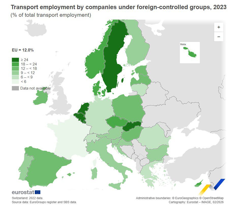Σύμφωνα με τα τελευταία στοιχεία που δημοσίευσε η στατιστική υπηρεσία της Ευρωπαϊκής Ένωσης, Eurostat, περίπου 1,3 εκατομμύρια εργαζόμενοι στον τομέα των μεταφορών και της αποθήκευσης στην ΕΕ το 2023 απασχολούνταν σε επιχειρήσεις που ανήκουν σε πολυεθνικές ομάδες (MNE) ελεγχόμενες από άλλες χώρες, όπως προκύπτει από το EuroGroups register και τα δεδομένα των επιχειρήσεων. Αυτή η ομάδα εργαζομένων αντιπροσώπευε περίπου 12% του συνολικού εργατικού δυναμικού στον κλάδο των μεταφορών.