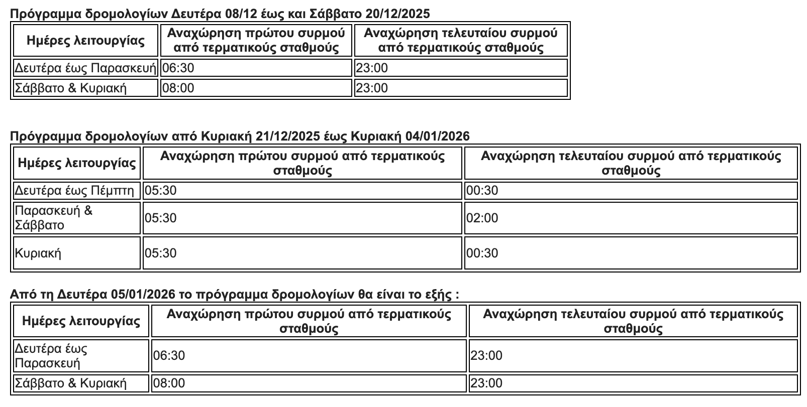 Παρότι οι δοκιμές θα συνεχιστούν και μετά την επαναλειτουργία της βασικής γραμμής, αποφασίστηκε η λειτουργία του μετρό να πραγματοποιείται με πλήρες ωράριο κατά την εορταστική περίοδο, εξασφαλίζοντας καλύτερη εξυπηρέτηση για το επιβατικό κοινό και ομαλή μετακίνηση στην πόλη.