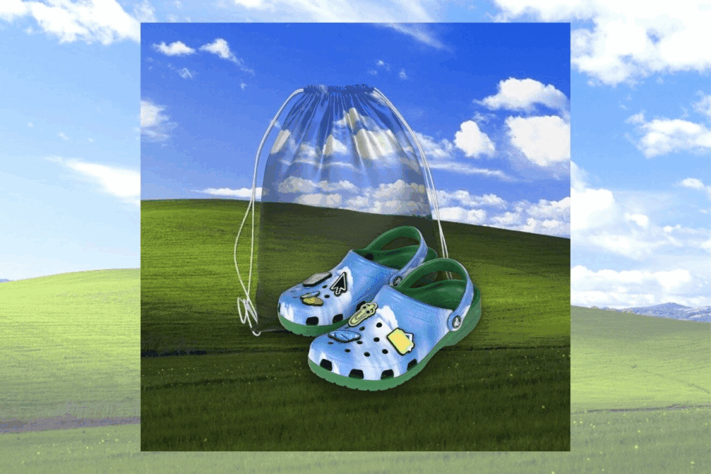 Τα Crocs παρουσιάζουν τον εμβληματικό γαλάζιο ουρανό με τα σύννεφα από την ταπετσαρία των Windows XP, συνδυασμένο με μια πράσινη σόλα που μιμείται το γρασίδι.